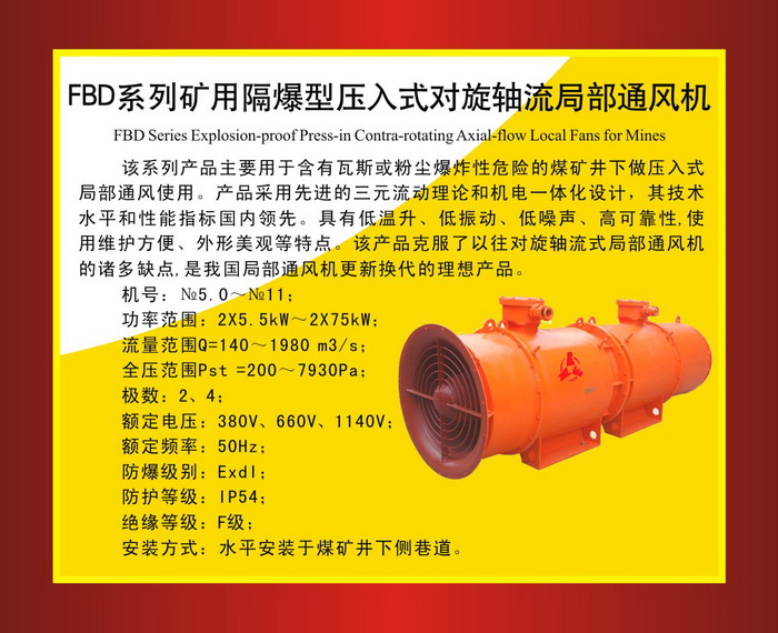 简要说明:FBD系列矿用隔爆型压入式对旋轴流局部通风机