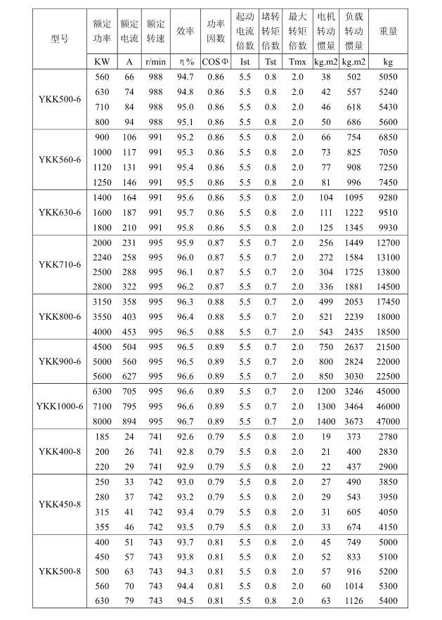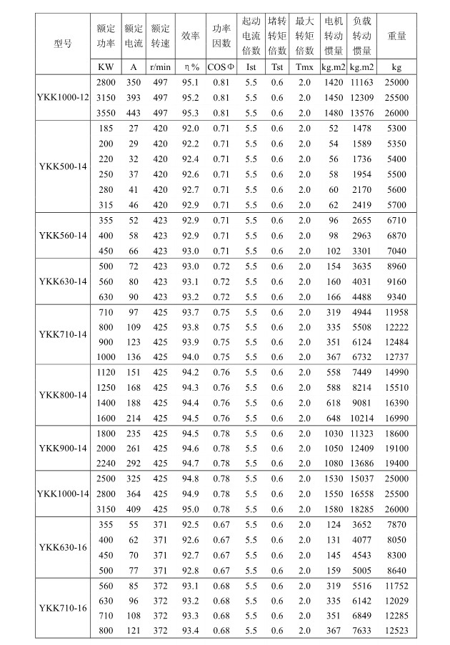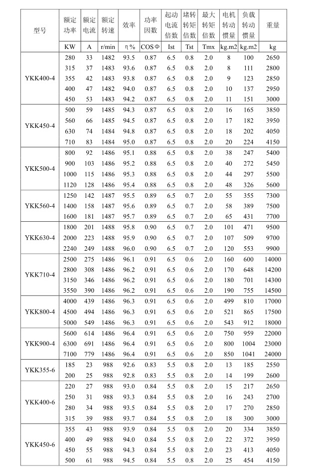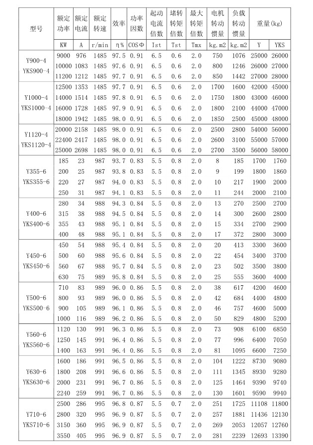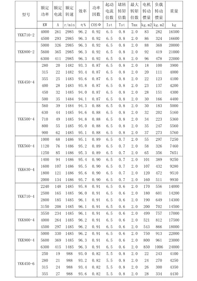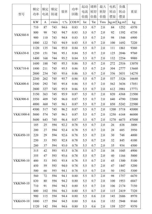 1 概述 YKK、Y、YKS 系列高压三相异步电动机(机座号355~1120)是我公司在引进吸收消化国外先进技术的基础上,结合我公司长期稳定生产高压三相异步电动机的设计制造经验而开发的新一代产品。 本系列电动机选材考究、制造精良、具有体积小、重量轻、功率大、效率高、噪声低、振动小、运行安全可靠、使用维护方便、节能环保等特点。 本系列电动机符合以下标准和规范 GB755 《旋转电机定额和性能》 GB/T13957 《大型三相异步电动机基本系列技术条件》 JB/T7593 《Y 系列高压三相异步电动机技术条件(机座号355-630)》 JB/T10315.1 《YKS、YKS-W、YQF 系列高压三相异步电动机技术条件(机座号 355-630)》 JB/T10315.2 《YKK、YKK-W 系列高压三相异步电动机技术条件(机座号355-630)》 GB10069.3 《旋转电机噪声测定方法及限值第 3 部分:噪声限值》 GB10068 《中心高为56mm及以上电机的机械振动振动的测量及限值》 2 型号说明