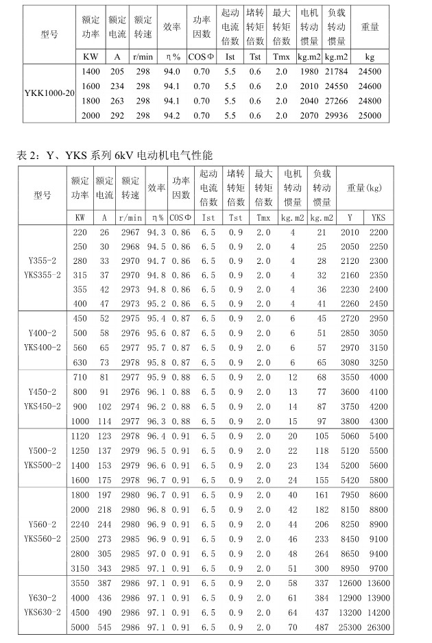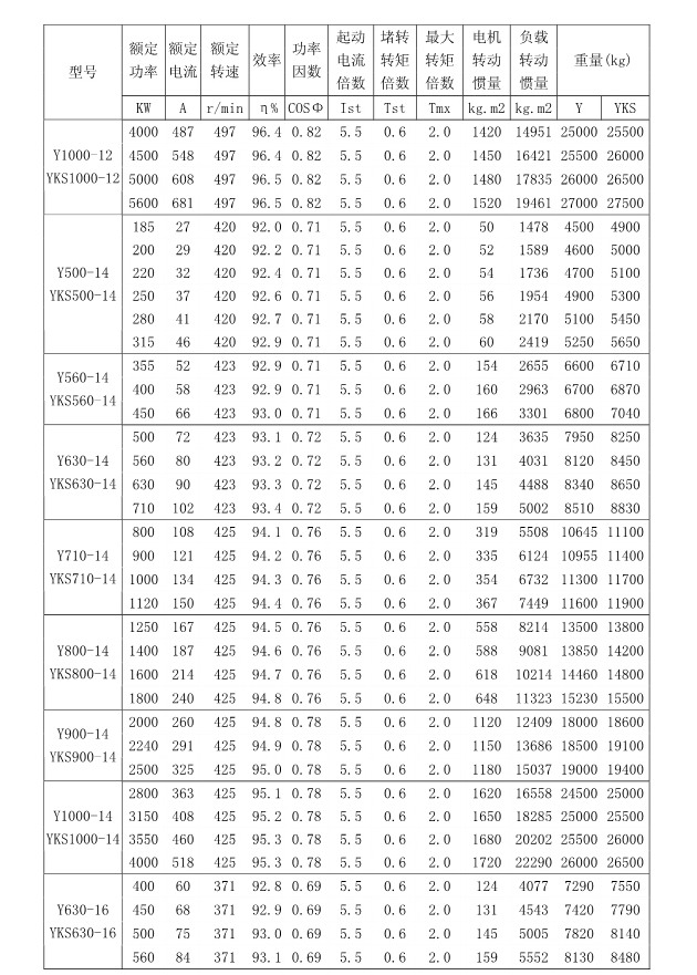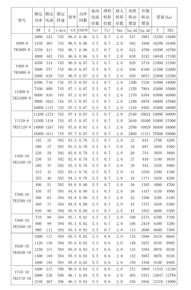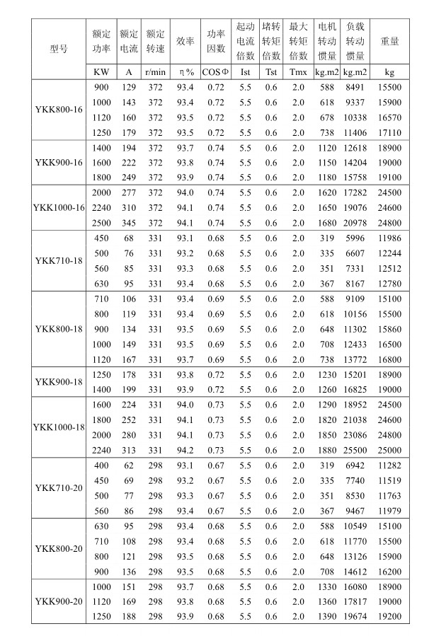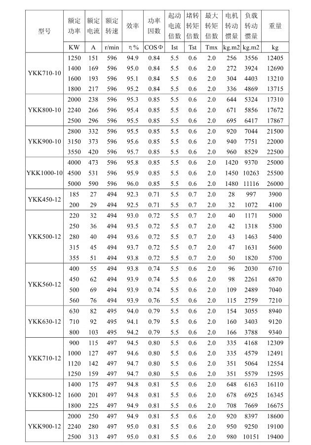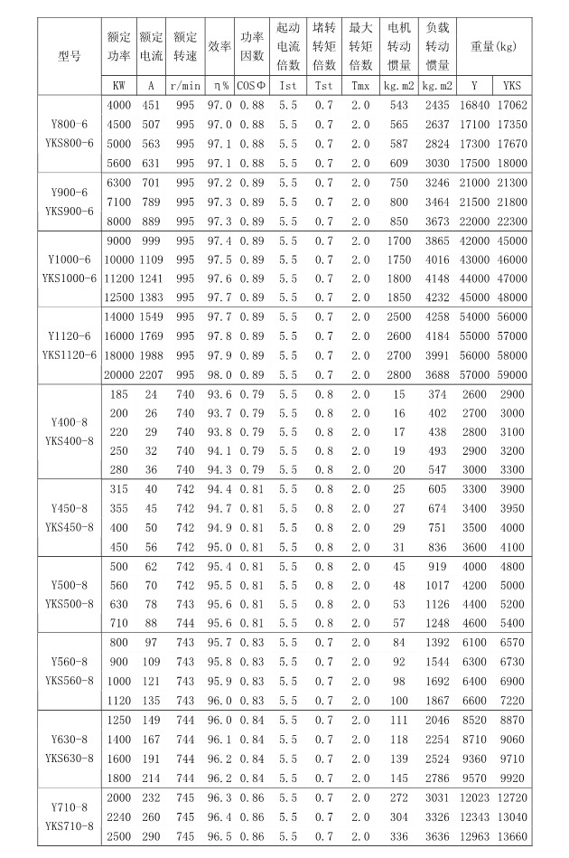1 概述 YKK、Y、YKS 系列高压三相异步电动机(机座号355~1120)是我公司在引进吸收消化国外先进技术的基础上,结合我公司长期稳定生产高压三相异步电动机的设计制造经验而开发的新一代产品。 本系列电动机选材考究、制造精良、具有体积小、重量轻、功率大、效率高、噪声低、振动小、运行安全可靠、使用维护方便、节能环保等特点。 本系列电动机符合以下标准和规范 GB755 《旋转电机定额和性能》 GB/T13957 《大型三相异步电动机基本系列技术条件》 JB/T7593 《Y 系列高压三相异步电动机技术条件(机座号355-630)》 JB/T10315.1 《YKS、YKS-W、YQF 系列高压三相异步电动机技术条件(机座号 355-630)》 JB/T10315.2 《YKK、YKK-W 系列高压三相异步电动机技术条件(机座号355-630)》 GB10069.3 《旋转电机噪声测定方法及限值第 3 部分:噪声限值》 GB10068 《中心高为56mm及以上电机的机械振动振动的测量及限值》 2 型号说明