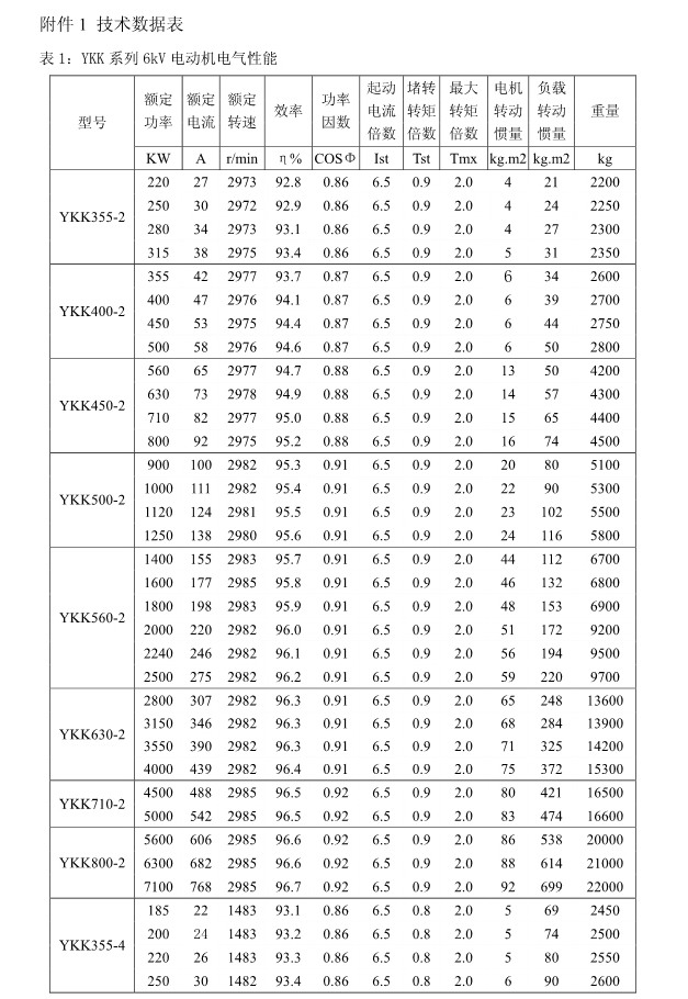 7、使用条件 额定电压: 6kV或 10kV±5% 额定频率: 50Hz±3% 环境空气温度: -5℃~+40℃ 海拔高度: 不超过 1000mm 工作制: 连续工作制 S1 环境条件: 户外(W)、户外防中腐蚀(WF1)、户外防强腐蚀(WF2)、化工防轻腐蚀(F)、化工防中腐蚀(F1)、化工防强腐蚀(F2)、湿热带(TH)、干热带(TA)、户外湿热带(WTH)、户外干热带(WTA) 注意:对环境空气温度、海拔、电源电压及频率如有特殊要求,请在订货时提出。 8 质量保证 公司视产品质量为企业的生命。先后取得ISO9001、ISO10012、OHS18000、ISO14001 管理体系认证。 拥有国际先进的软件,实现了虚拟样机设计开发。将设计-工程分析-模拟装配-失效模式分析等各个环节组成一个完整的产品开发体系。对产品进行最终检验和性能测试。 按照公司质量保证声明,做好产品销售每个环节的服务。 9 订货指南 订货时请注明电动机的型号、额定电压、额定功率、频率、极数、安装型式、冷却方式、防护等级、旋转方向、使用环境、海拔高度等。 如有特殊要求,双方签订协议后,还可提供各种特殊规格电机(如不同电压、不同频率、双轴伸、接线盒位置、噪声要求、不同环境条件、干湿热带型等)。 用以传动鼓风机、磨煤机、轧钢机、卷扬机、皮带机的电动机在订货时提供有关技术资料,并要签订技术协议,作为电机特殊设计的依据,以确保电机的可靠运行。 本系列电动机也可制成变频电机,变频范围0~60Hz,功率等级、外形尺寸等另行通知。 随着产品的技术进步和国内外相关标准的修订,样本技术参数如有变动,恕不另行通知,订货后请向我公司索取外形安装尺寸及技术数据,最终以提供资料数据为准。 附件 1 技术数据表 附件 2 安装尺寸表